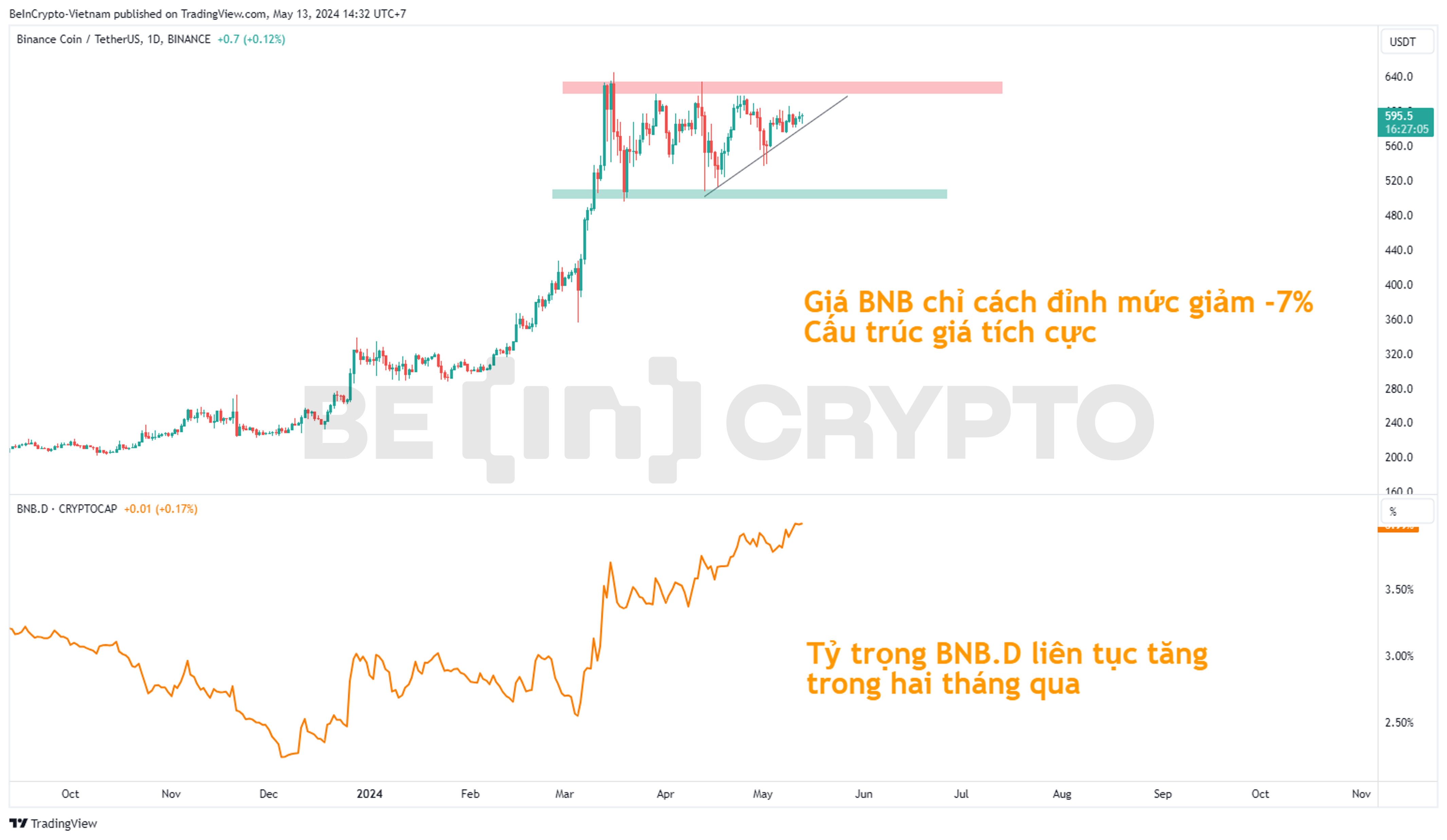 Altcoin đầu tiên đáp ứng được tất cả các tiêu chí trên phải kể đến Binance Coin (BNB). Tính đến nay, BNB chỉ đáng cách đỉnh cũ của tháng 3/2024 ở mức giảm -7% mà thôi, tốt hơn rất nhiều so với mặt bằng chung của thị trường.