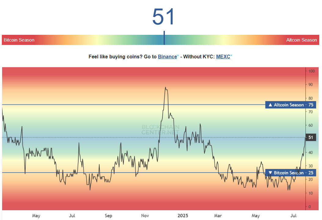 Dòng vốn hiện đang ưu tiên altcoin hơn Bitcoin, càng củng cố tâm lý tích cực. Một mùa altcoin được xác nhận khi 75% trong số 50 đồng tiền điện tử hàng đầu—không bao gồm stablecoin và token được hỗ trợ bằng tài sản—vượt trội hơn Bitcoin trong 90 ngày.