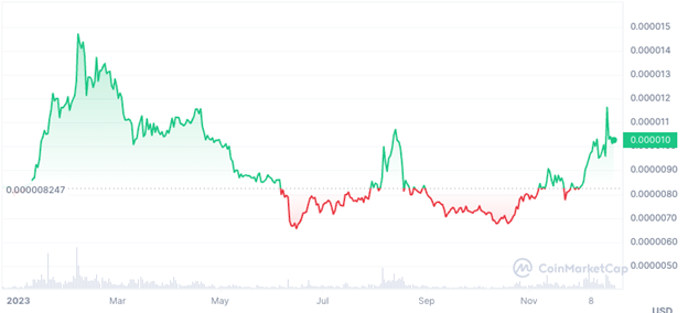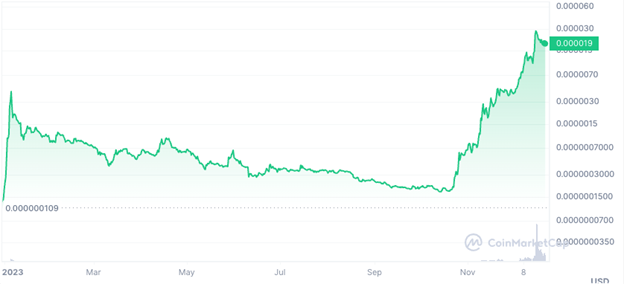 Bonk đã chứng kiến mức tăng chóng mặt 17471.05% kể từ khi ra mắt vào tháng 12/2022. Hiện có giá 0.00001924 nâng vốn hóa thị trường của Bonk lên 1.17 tỷ USD.