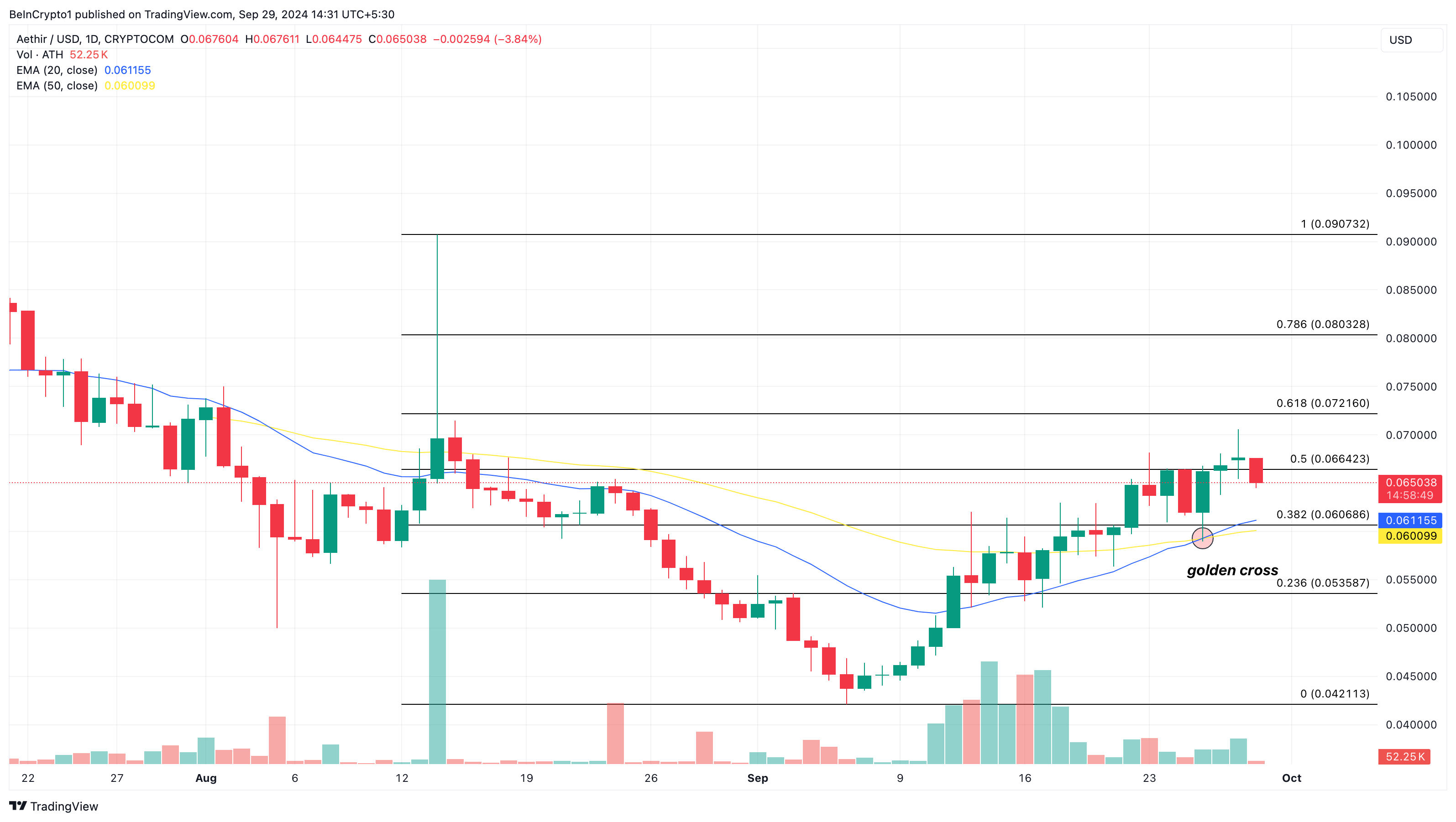 Mặc dù có sự giảm giá gần đây, sự hình thành của golden cross cho thấy giá ATH có thể sẽ quay trở lại hướng bắc. Nếu điều đó xảy ra, giá ATH có thể tăng lên đến 0.090 USD vào tháng tới. Ngược lại, giá Aethir có thể giảm xuống còn 0.053 USD nếu EMA 50 vượt qua EMA 20 một lần nữa, làm mất hiệu lực dự đoán tăng giá.