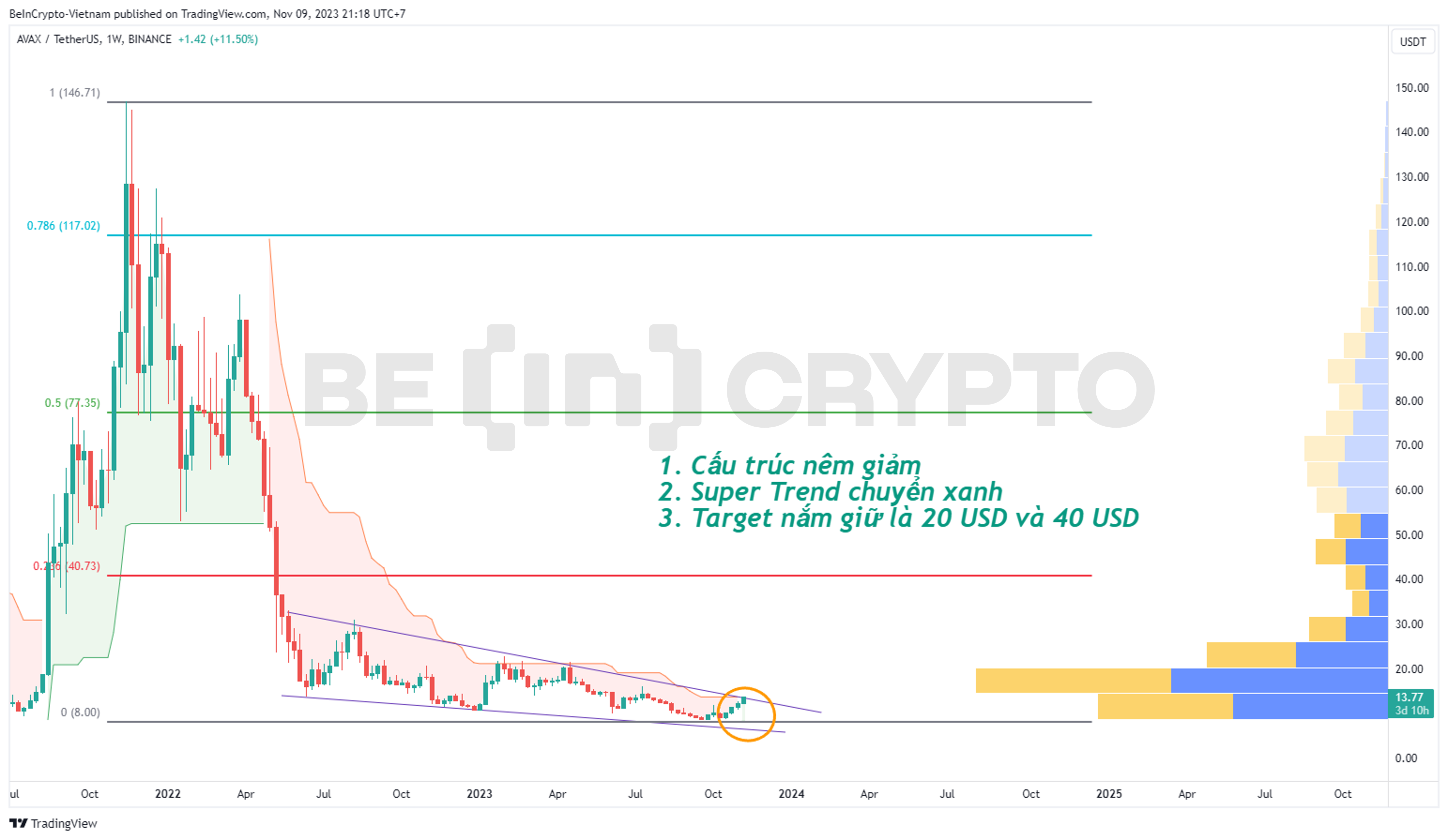 - Cấu trúc giá của gần hai năm qua theo mô hình nêm giảm là một cấu trúc dự báo tăng giá. Tuy nhiên, giá AVAX lại đang nằm ngay trendline kháng cự của mô hình này. Nếu giá AVAX hiệu nghiệm nêm giảm, thì vùng 20 USD là vùng Point of Control có khả năng cho lực bán mạnh.