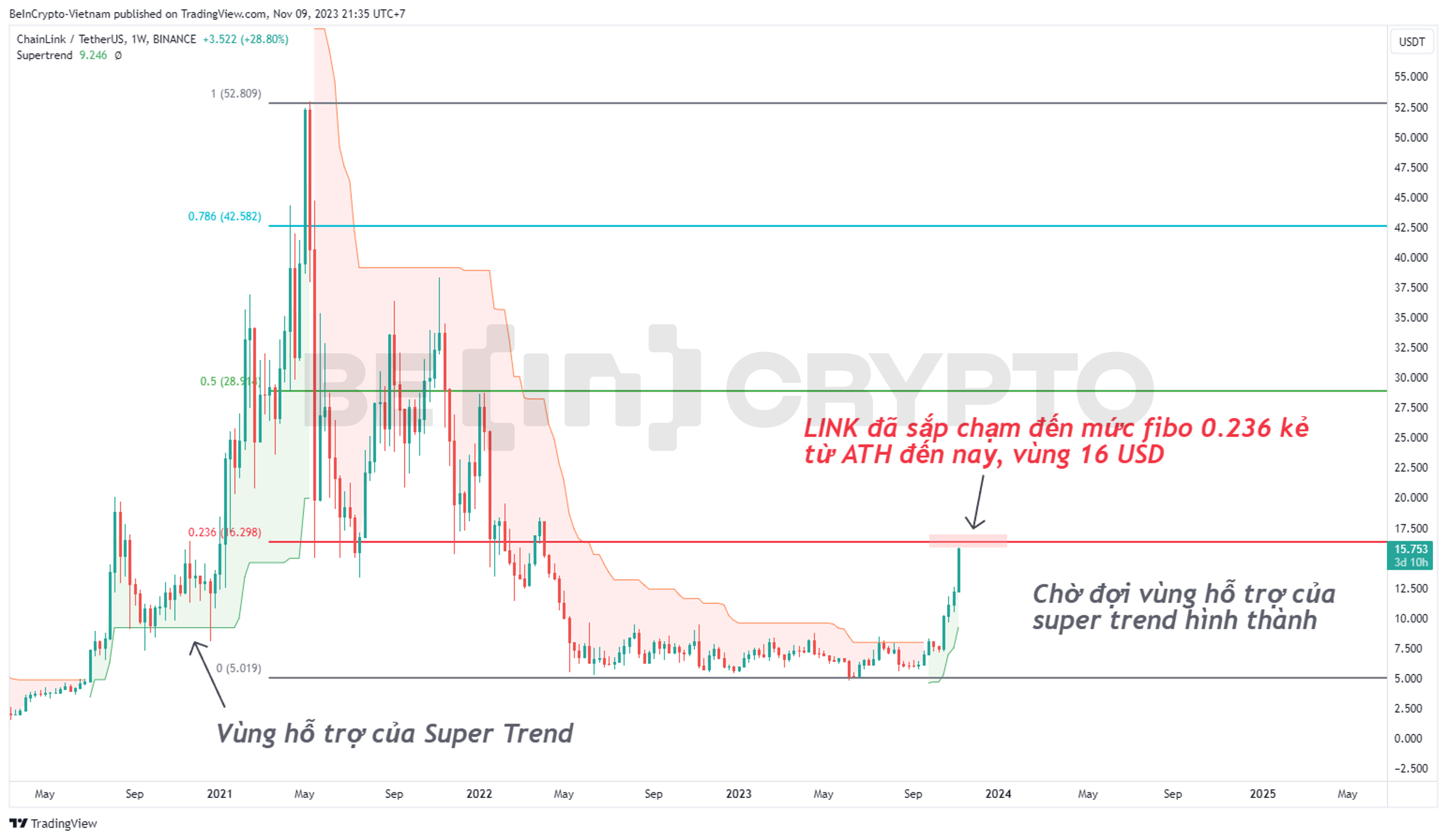 Năm 2019, sau khi tăng mạnh từ 5 USD đến gần 20 USD, giá LINK đã quay lại hỗ trợ của Super Trend để tăng nhịp tiếp theo. Thật trùng hợp là đà tăng của LINK năm 2023 cũng xuất phát bằng vùng giá tương đương.