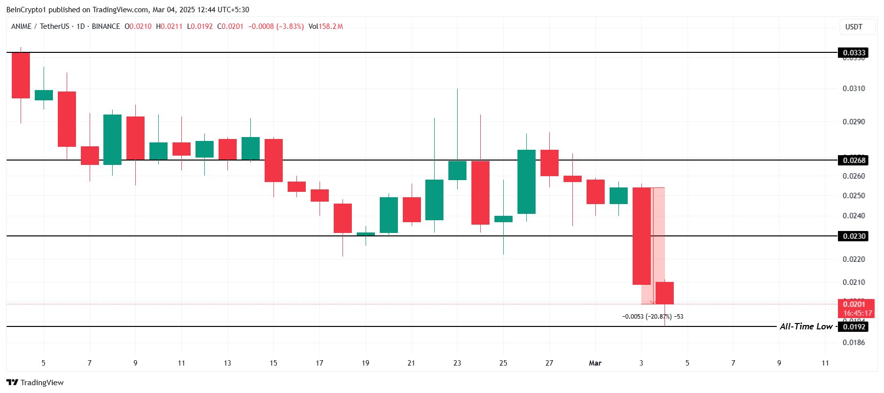 Giá ANIME giảm 20% trong ngày qua, hiện đang giao dịch ở mức 0.0201 USD. Sự sụt giảm đã đẩy altcoin này xuống mức thấp nhất mọi thời đại mới là 0.0192 USD sau khi mất hỗ trợ quan trọng tại 0.0230 USD. Sự suy giảm mạnh đã gia tăng áp lực bán, khiến việc phục hồi trở nên khó khăn hơn nếu không có sự quan tâm mới từ nhà đầu tư.