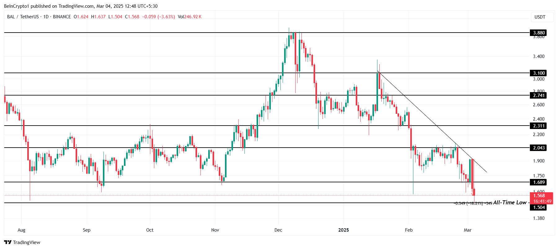 Mức giảm 18% trong 24 giờ qua đã đưa BAL xuống 1.56 USD tại thời điểm viết bài. Đây là mức thấp nhất mọi thời đại đầu tiên kể từ tháng 08/2024, gia tăng khả năng bán tháo hoảng loạn. Nếu nhà đầu tư chọn thanh lý tài sản, BAL có thể đối mặt với sự sụt giảm thêm, củng cố xu hướng giảm giá.