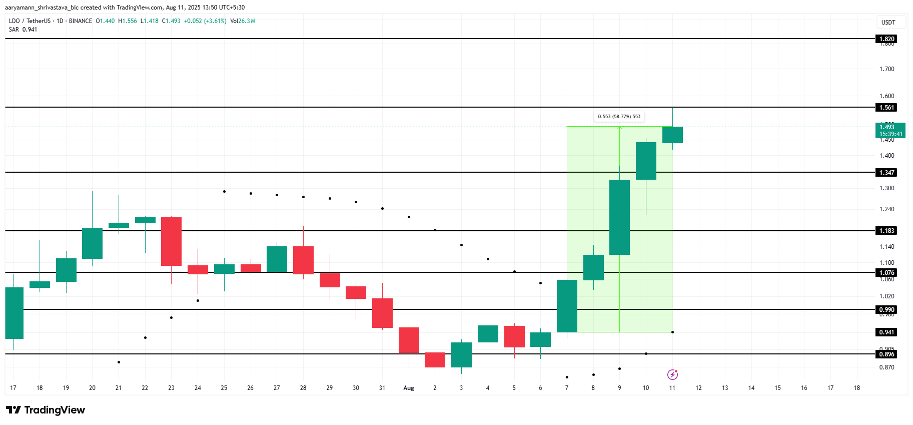 LDO đã chứng kiến sự tăng trưởng ấn tượng trong tuần này, tăng 58% chỉ trong năm ngày. Hiện đang giao dịch ở mức 1.49 USD, altcoin này đang trải qua động lực tích cực, phản ánh sự tin tưởng của nhà đầu tư. Sự tăng trưởng này báo hiệu tiềm năng cho sự phát triển tiếp theo, với LDO đang nhắm tới việc phá vỡ các mức kháng cự sớm.