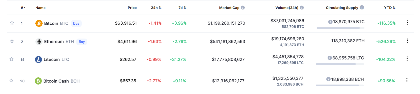 Tiền điện tử có vốn hóa lớn thứ hai, Ethereum cũng giảm 1.63%, hiện giá ETH là 4,611 USD. Ngoài ra, Litcoin giảm 0.99% (262.5 USD) và Bitcoin Cash giảm 2.7% (657.3 USD). Giá Doge cũng không ngoại lệ khi giảm 1.2% (0.25 USD) trong 24 giờ.