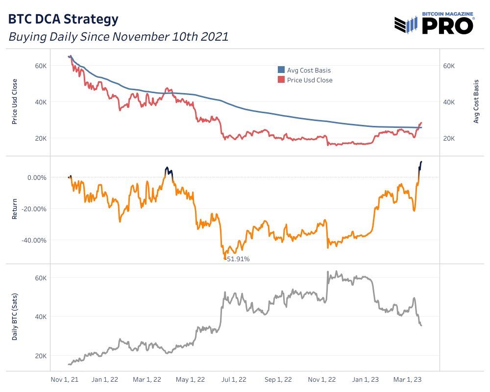 Cho đến nay, giá BTC tăng đã khiến chiến lược DCA cho kết quả từ âm sang dương chỉ trong một tuần qua. Đồng thời giá BTC cũng vừa vượt qua mức Avg Cost Basic (chi phí cơ bản trung bình). Từ đây, tâm lý của những người mua được giải tỏa sau một năm chịu lỗ. Đồng thời những người có lời sẽ bắt đầu có tâm lý chốt dần để đảm bảo không lỗ lại như cả năm qua.