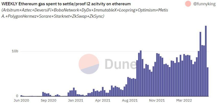 Tuy nhiên, kể từ đầu tháng, Ethereum tiếp tục ghi nhận mức phí gas tăng cao. Vào tháng 6, Dune Analytics đã ghi nhận sự gia tăng đột biến trong lượng gas Ethereum hàng tuần được chi để giải quyết các hoạt động L2 trên blockchain.