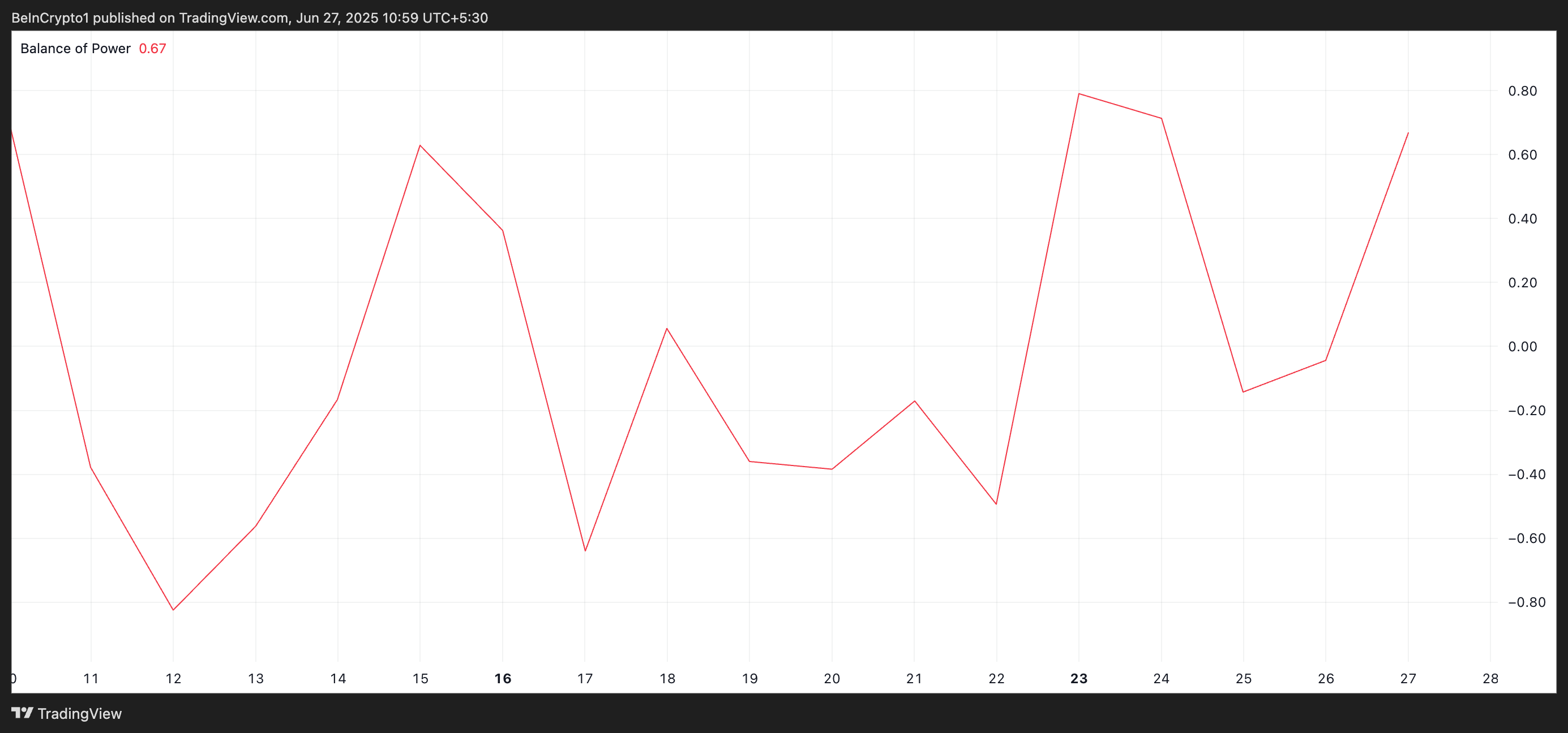 Chỉ số BOP đo lường sức mạnh của người mua so với người bán bằng cách so sánh phạm vi giá trong một khoảng thời gian giao dịch. Khi BOP dương, người mua chiếm ưu thế trên thị trường, cho thấy áp lực tăng giá đối với tài sản.