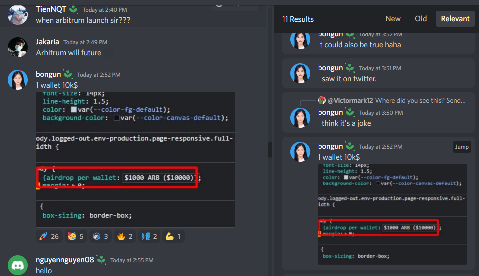 Bởi lẽ, tính đến thời điểm BeInCrypto viết bài này, đội ngũ Arbitrum vẫn chưa có bất cứ thông tin xác nhận chính thống nào về việc sẽ airdrop cho người dùng. Ngoài ra, đoạn code được chia sẻ trên Arbitrum Discord cũng không có gì đảm bảo nó thuộc mã nguồn mở của dự án. Chưa kể đến việc, tài khoản của người chia sẻ, theo ghi nhận của BeInCrypto mới chỉ tham gia Arbitrum Discord từ ngày 23/10/2022.