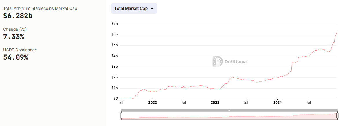 Dữ liệu defillama cho thấy, vốn hóa stablecoin trên Arbitrum đã tăng mạnh trong những tháng gần đây và vượt 6.2 tỷ USD, trong đó hơn 54% là USDT. Đây là mức cao nhất kể từ năm 2021 đến nay. Nhu cầu stablecoin trong uptrend đã giúp Arbitrum phát huy vai trò của mình.