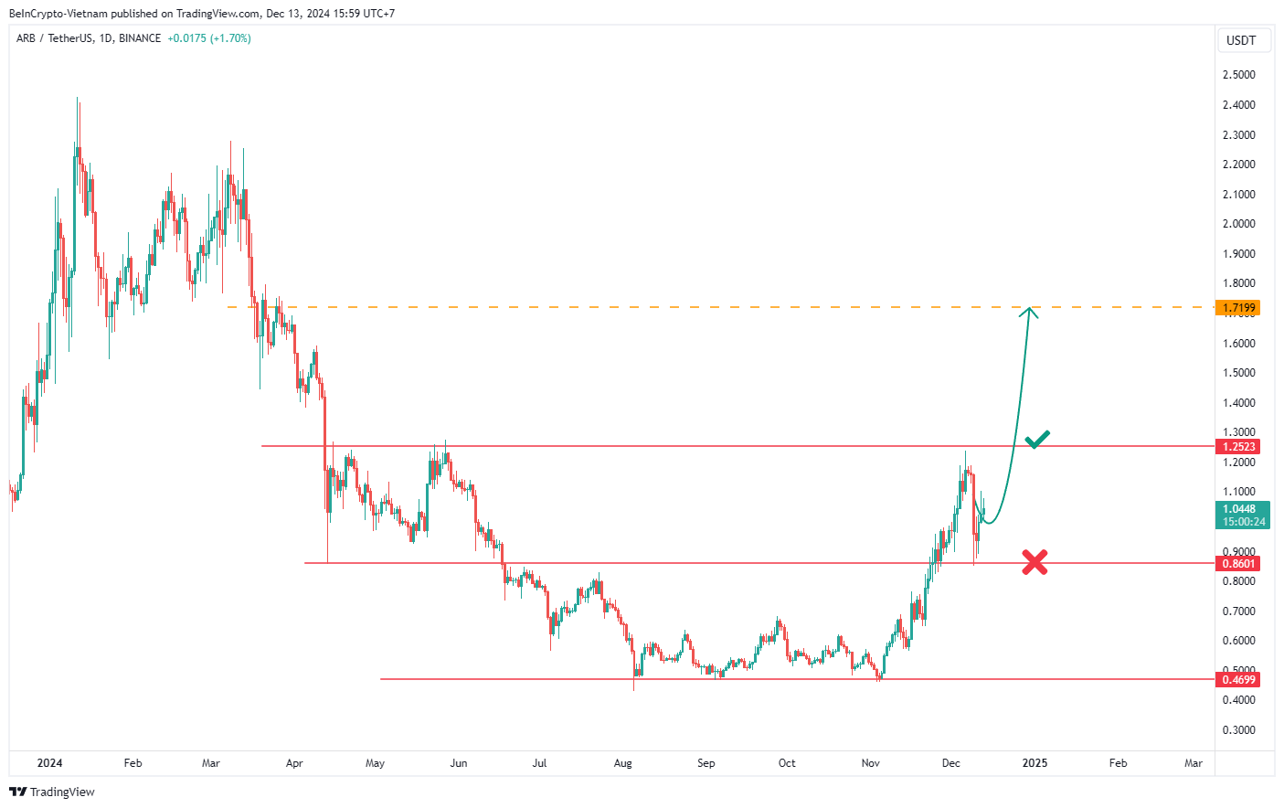 ARB đã vượt khỏi kháng cự 0.86 USD, và mức giá này trở thành hỗ trợ quan trọng của ARB trong hành trình giá năm 2025. Với sự khởi sắc của thị trường chung và của những dấu hiệu nói trên, nếu ARB vượt được kháng cự 1.25 USD, giá sẽ có khuynh hướng tiếp tục tăng đến kháng cự tiếp theo tại 1.70 USD. Khi đó, ARB có nhiều hy vọng để trở lại đỉnh cũ hơn. Ngược lại, nếu hỗ trợ 0.86 USD bị phá vỡ, ARB có thể bước vào một giai đoạn sideway mới.