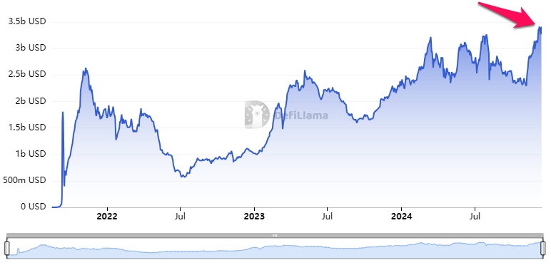 Theo dữ liệu của IntoTheBlock, Arbitrum là chuỗi có số lượng địa chỉ thua lỗ nhiều thứ 2 thị trường, đến 60% địa chỉ thua lỗ, chỉ xếp sau Axie Infinity (AXS). Tuy nhiên, tháng 12 ghi nhận dấu hiệu dòng tiền chảy vào Layer 2 này. Dấu hiệu đầu tiên đó là tổng giá trị khóa trong (TVL) trên Arbitrum vừa lập mức cao mới trong ba năm qua, hơn 3.4 tỷ USD.
