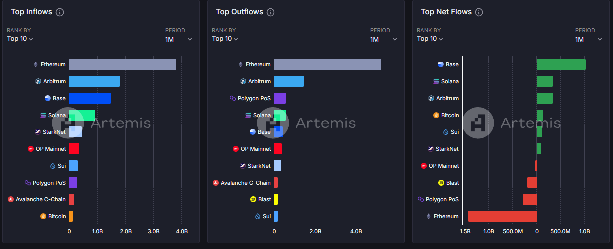 Nếu tính tổng TVL theo ARB, thì số lượng ARB được khóa trong các giao thức của Layer 2 này vẫn chưa trở lại mức cao. Nhưng đã có dấu hiệu tăng nhẹ trong tháng 12, từ 2.9 tỷ ARB lên 3.4 tỷ ARB. Bên cạnh việc TVL tăng, thì netflow của Arbitrum cũng nằm trong TOP3 thị trong một tháng gần đây.