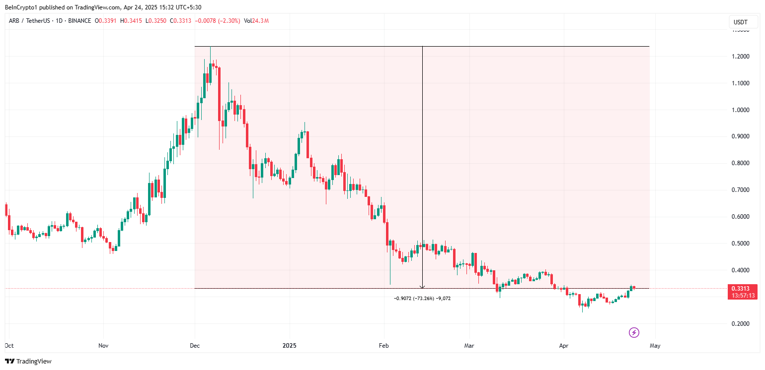 Tuy nhiên, ARB token của Arbitrum vẫn thấp hơn 70% so với mức cao 1.23 USD vào ngày 06/12. Dữ liệu trên BeInCrypto cho thấy nó đang giao dịch ở mức 0.33 USD tại thời điểm viết bài.