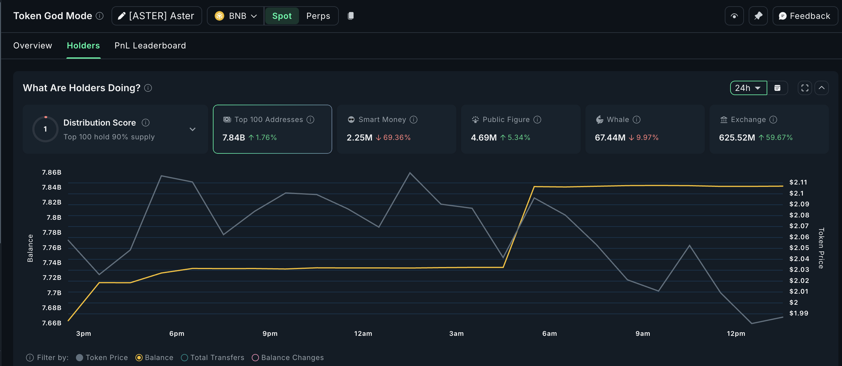 100 địa chỉ hàng đầu — hay “cá voi lớn” — hiện nắm giữ khoảng 7.84 tỷ ASTER, tăng 1.76% trong 24 giờ. Đó là khoảng 134 triệu ASTER, trị giá khoảng 264 triệu USD theo giá hiện tại.