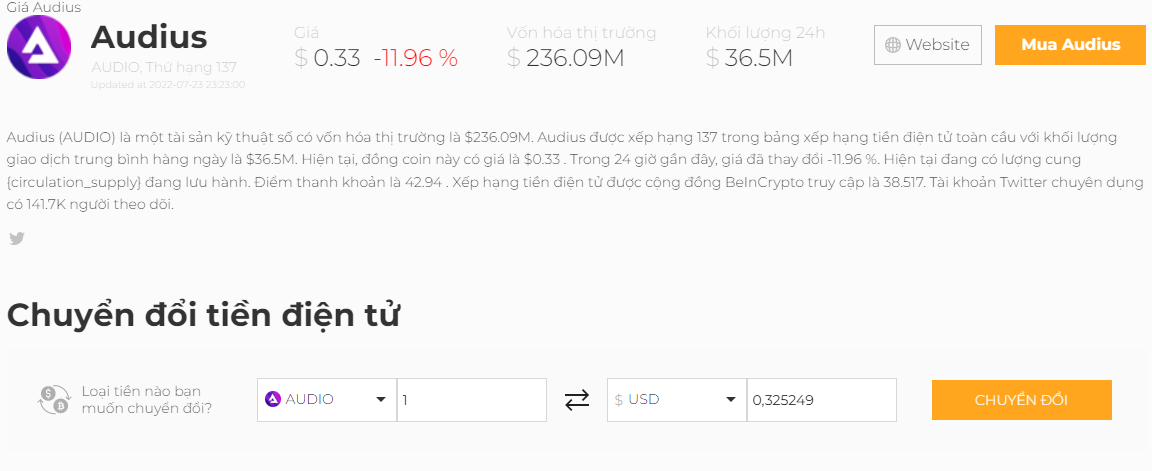 Sau động thái bị hack lần này, giá token AUDIO đã có dấu hiệu giảm mạnh. Theo ghi nhận từ Website của BeInCrypto, giá AUDIO đã giảm khoảng 12% trong khung thời gian 24 giờ qua. Tại thời điểm viết bài nó đang được giao dịch ở mức 0.33 USD.
