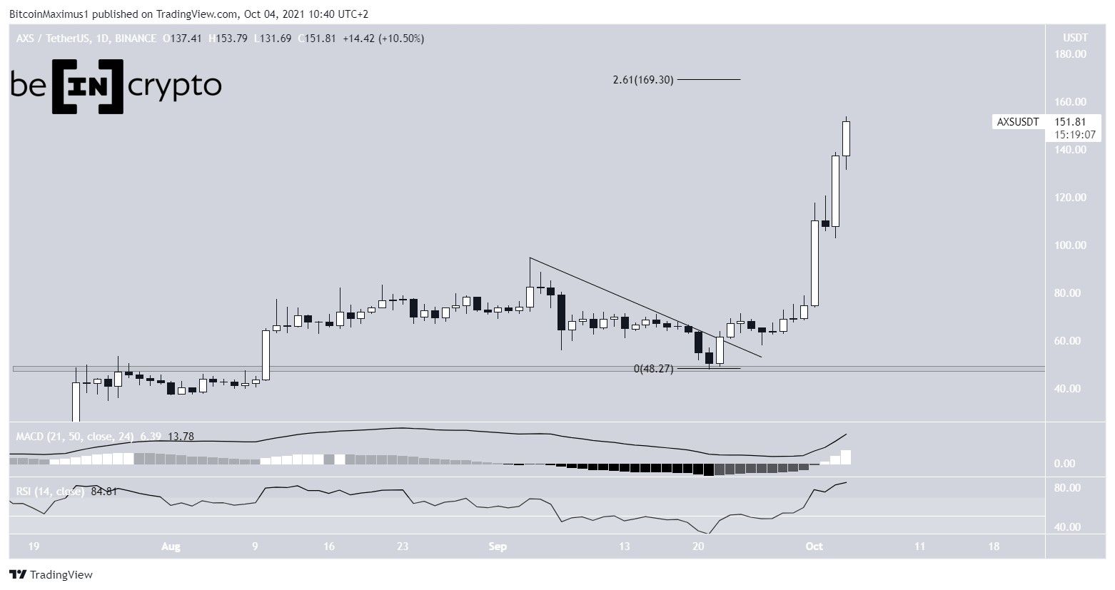Giá AXS đã tăng lên kể từ khi nó bứt phá khỏi đường kháng cự giảm dần vào ngày 23 tháng 9. Sự đột phá được hỗ trợ bởi sư tăng lên của cả hai chỉ báo kỹ thuật là RSI và MACD.