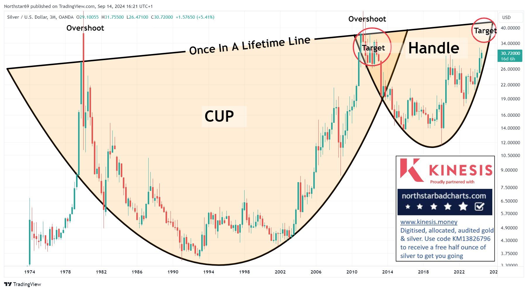 Chuyên gia phân tích kỹ thuật @NorthstarCharts đã chia sẻ biểu đồ giá Bạc trong khung 3 tháng kể từ năm 1974 cho đến nay, và nhận định rằng toàn bộ cấu trúc giá của Bạc đang tạo nên mô hình Cốc và Tay cầm khổng lồ. Góc nhìn này mở ra một siêu chu kỳ mới đang chờ đợi Bạc.