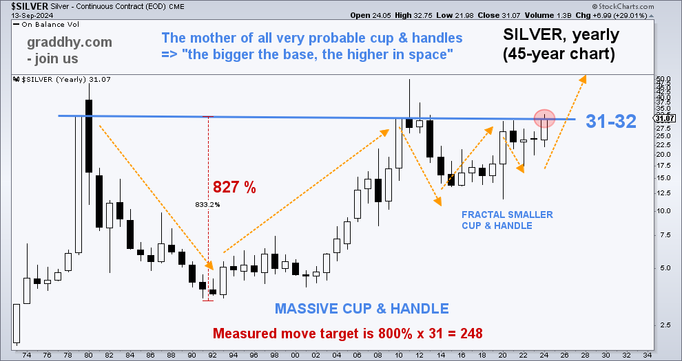 Graddhy – một chuyên gia phân tích kỹ thuật khác có 29 năm kinh nghiệm thị trường – cũng đồng ý với kịch bản tăng giá theo mô hình này. Khi được hỏi về target của giá Bạc, Graddhy trả lời rằng giá có thể tăng đến 370 USD, dựa trên phép đo giá tương đương từ đáy cốc đến đường neckline. Nhưng trước mắt, trong vài năm tới, Bạc có thể vượt 31 USD – 32 USD và tăng đến vùng 50 USD.