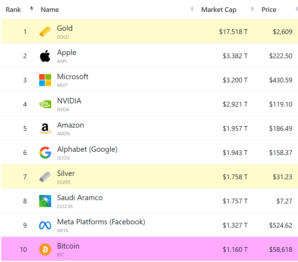 Số liệu mới nhất cho thấy, vốn hóa Bitcoin xếp thứ 10 với 1,160 tỷ USD còn Bạc vươn lên vị thứ 7 với 1,758 tỷ USD. Trong năm 2024, Bạc là tài sản có khả năng giữ giá tốt khi đến nay vẫn duy trì được trên 30 USD/Ounce.