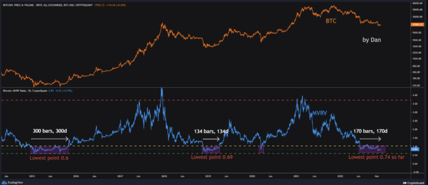 Chỉ số on-chain Bitcoin Market Value to Realized Value (MVRV) cũng cho thấy một cách thú vị về đáy BTC. Một phân tích gần đây của CryptoQuant cho thấy rằng ở đáy của các thị trường gấu trong quá khứ, trong suốt lịch sử của chỉ báo MVRV, cho biết giá Bitcoin được định giá quá cao hay thấp.