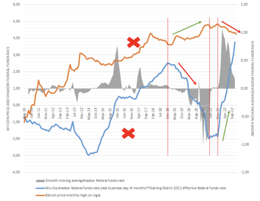 Các nhà phân tích tiền điện tử đã lưu ý rằng kể từ chu kỳ này, chính sách tiền tệ dường như đã trở nên phù hợp với Bitcoin. Đỉnh điểm của “tỷ lệ quỹ liên bang bóng mờ” (the shadow federal funds rate) vào ngày 18/12/2021 ít nhiều đã đánh dấu đáy của thị trường giá xuống. Đáng chú ý, khi quỹ liên bang bóng mờ tăng mạnh vào tháng 12/2021, thị trường giá xuống Bitcoin bắt đầu.
