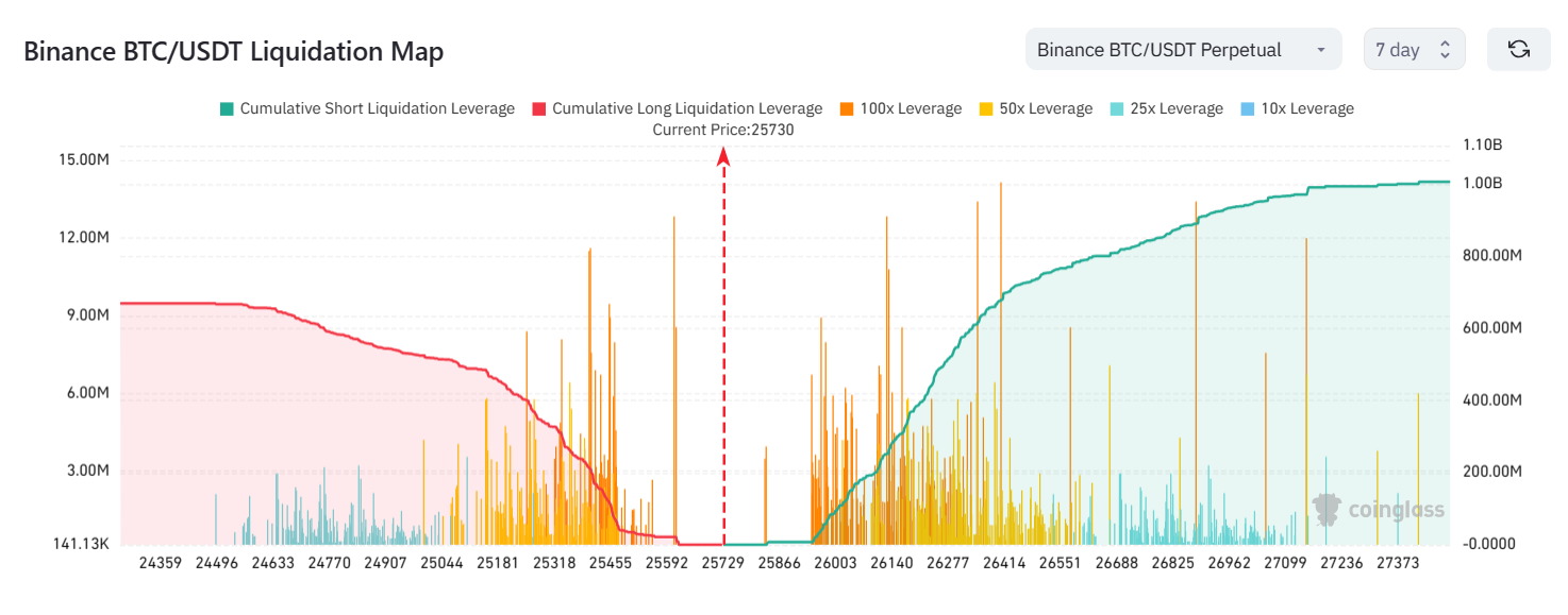 - Thời điểm bài viết giá BTC đang quanh 25,750 USD. Gần 700 triệu USD giá trị lệnh Short với đòn bẩy x100, x50 sẽ bị thanh lý khi giá BTC tăng thêm chỉ 4% nữa từ mức hiện tại, tức 26,700 USD. Với mức giá thanh lý lớn và sát hiện tại như vậy, có thể thấy tâm lý brearish đang áp đảo trong ngắn hạn.