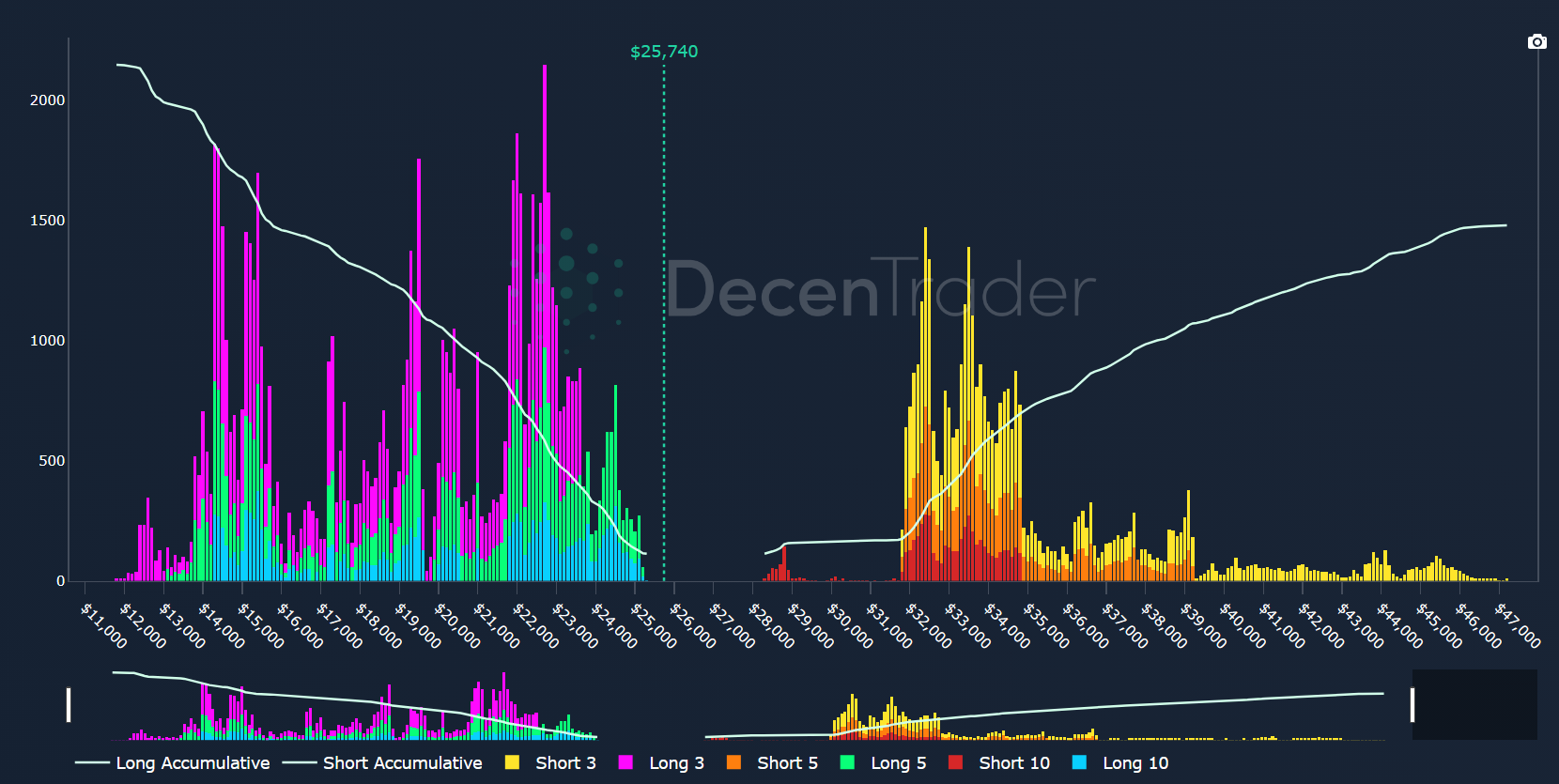 - Đi vào chi tiết hơn trong ngắn hạn, thì phần lớn thanh lý Long x3, x5, x10 nằm ở vùng giá từ 23,500 USD trở xuống (vùng histogram cao nhất màu hồng bên trái). Điều này cho thấy rất nhiều traders đang đặt cược giá BTC sẽ phục hồi từ vùng 23,500 USD trở lên.