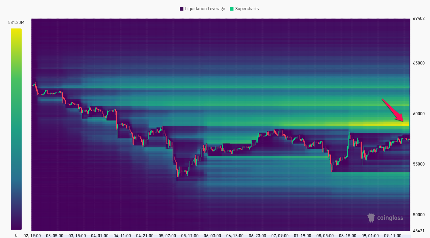 Mức giá thanh lý có thể gây ảnh hưởng đến bên mua hoặc bên bán trên order book khi sự thanh lý xảy ra, dẫn đến khả năng giá đảo ngược trở lại. Do đó, vùng 59,000 USD cũng đóng vai trò là vùng kháng cự mạnh hiện tại.