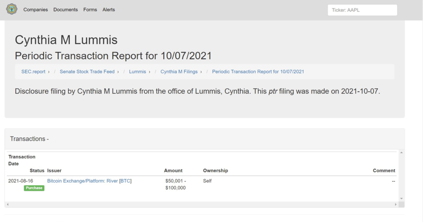 Theo báo cáo từ SEC, thượng nghị sĩ đảng Cộng Hòa đã khai báo giá trị Bitcoin nắm giữ vào tháng 8. Cụ thể, hồ sơ giao dịch của bà Cynthia Lummis được thực hiện vào ngày 20/10/2017. Theo khai báo vào ngày 16/08/2021, bà đang sở hữu số lượng Bitcoin trị giá khoảng 50,001 USD – 100,000 USD. Hồ sơ của bà được thực hiện trên sàn giao dịch River.