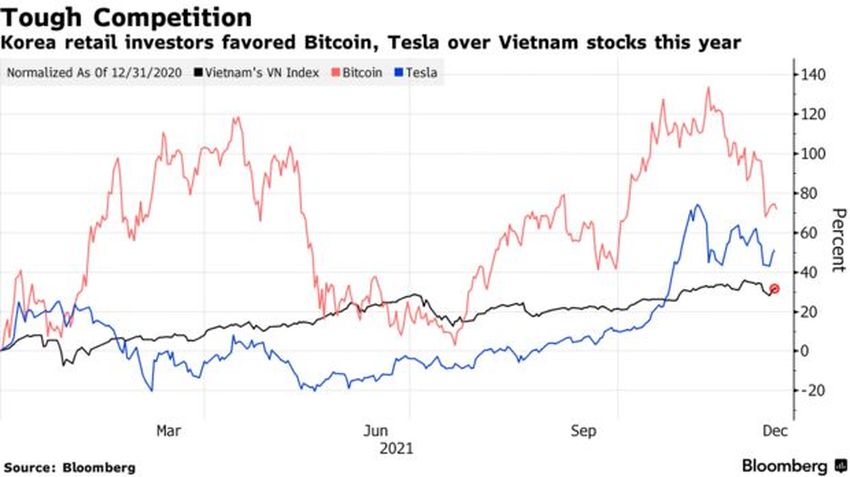 Theo Bloomberg, các nhà đầu tư cá nhân Hàn Quốc đã rút khỏi thị trường chứng khoán Việt Nam, thay vào đó, họ đổ vốn vào tiền điện tử và cổ phiếu công nghệ.