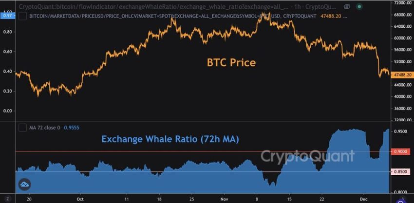 Trước đó, vào ngày 24/11 khi Bitcoin vẫn còn được giao dịch ở vùng 57,000 USD, Ki Young Ju đã chia sẻ biểu đồ Exchange Whale Ratio như trên và dự báo một nhịp giảm sắp xảy ra. Quả đúng như vậy, chỉ một tuần sau giá Bitcoin đã đối diện đợt panic sell đến tận 42,000 USD. Tuy nhiên, tín hiệu trên vẫn chưa dừng lại. Exchange Whale Ratio đã tiếp tục chạm đến 0.95.
