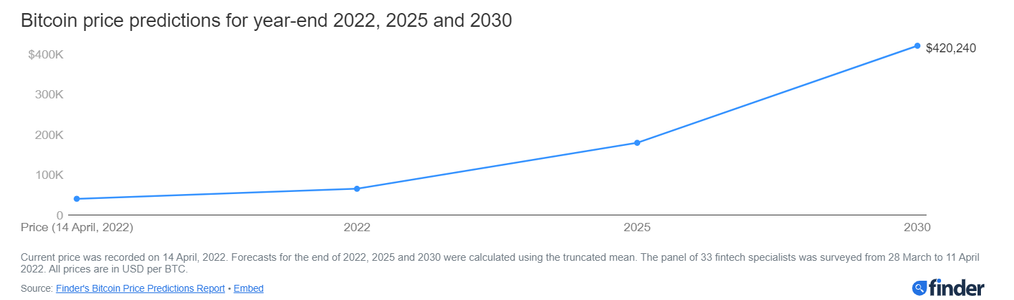 Theo báo các cuộc khảo sát của Finder vào cuối tháng 4, có khoảng 35 chuyên gia thực hiện. Đáng chú ý, đa số các chuyên gia dự đoán giá Bitcoin đạt mức 65,185 USD vào cuối năm 2022. Vào năm 2025, Bitcoin sẽ tăng lên 179,280 USD và tiếp tục tăng lên 420,240 USD vào cuối năm 2030.