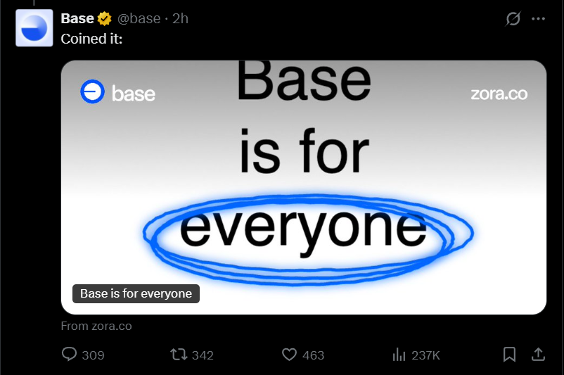 Dòng tweet của Base, với hình ảnh quảng cáo và liên kết trực tiếp đến meme coin trên Zora, đã tạo ra cảm giác hợp pháp.