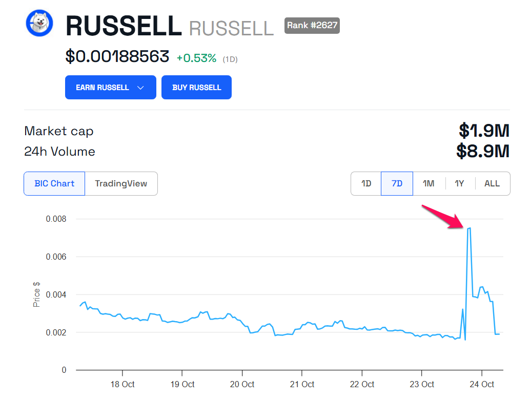 Vốn hóa thị trường của RUSSELL đã tạm thời vượt quá 10 triệu USD, chỉ để rơi trở lại 1.9 triệu USD vài giờ sau. Giá của nó cũng quay trở lại mức 0.0018 USD. Russell là tên của một con chó trong bức ảnh cưới mới đăng bởi Brian Armstrong. Meme coin cùng tên được tạo ra bởi người dùng và không có liên kết trực tiếp với Armstrong.