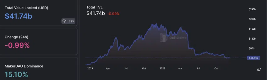 TVL hiện ở mức 41.74 tỷ USD, giảm 77% so với mức cao nhất mọi thời đại vào tháng 11/2021. Nếu một đợt tăng giá bắt đầu, dòng chảy tiền của các tổ chức vào DeFi sẽ tăng lên và điều này có thể kích hoạt một thị trường tăng giá.