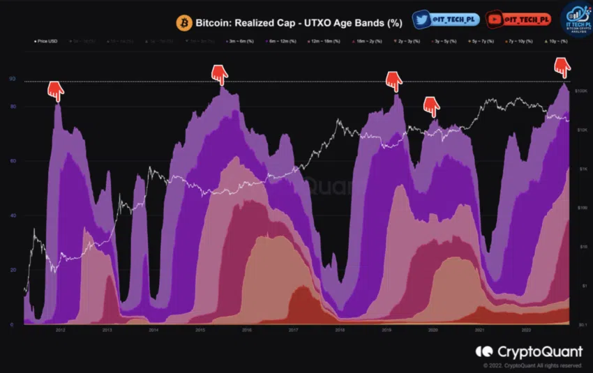 Một nhà phân tích CryptoQuant khác, IT Tech, tin rằng BTC đang tiến gần đến đáy của chu kỳ, khi xem xét chỉ số UTXO của nó. Đáng chú ý, UTXO hơn 6 tháng tuổi chiếm gần 90% realized cap. Trong đợt bán tháo các chu kỳ trước vào tháng 9/2015 và tháng 4/2019, chỉ báo này đạt trên 70% rồi bắt đầu giảm.
