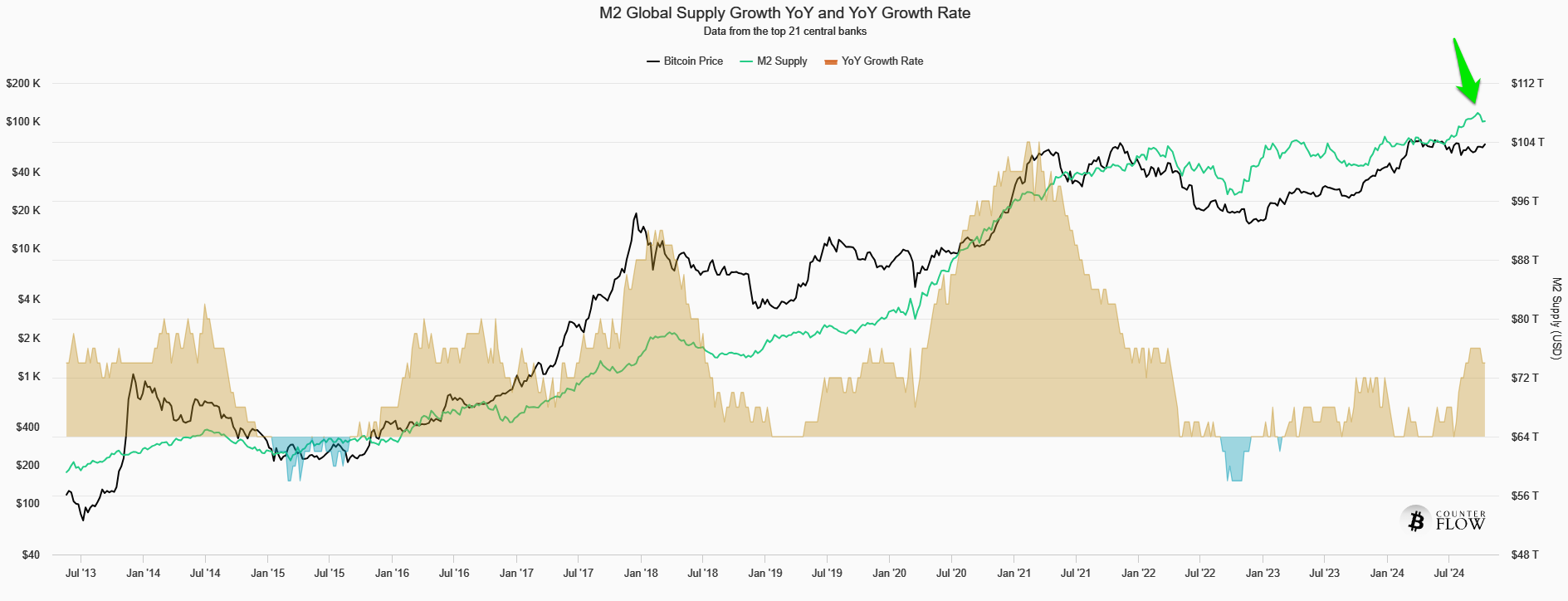 Nguồn tiền M2 toàn cầu hiện đã vượt quá 107.1 nghìn tỷ USD, tăng từ 104 nghìn tỷ USD vào đầu năm. Tỷ lệ tăng trưởng hàng năm của nó là 7%, cao nhất kể từ tháng 12/2021. Đồng sáng lập Solana Labs, Toly, cũng không đồng ý với Malekan, đưa ra quan điểm nghiêng về tâm lý giao dịch.