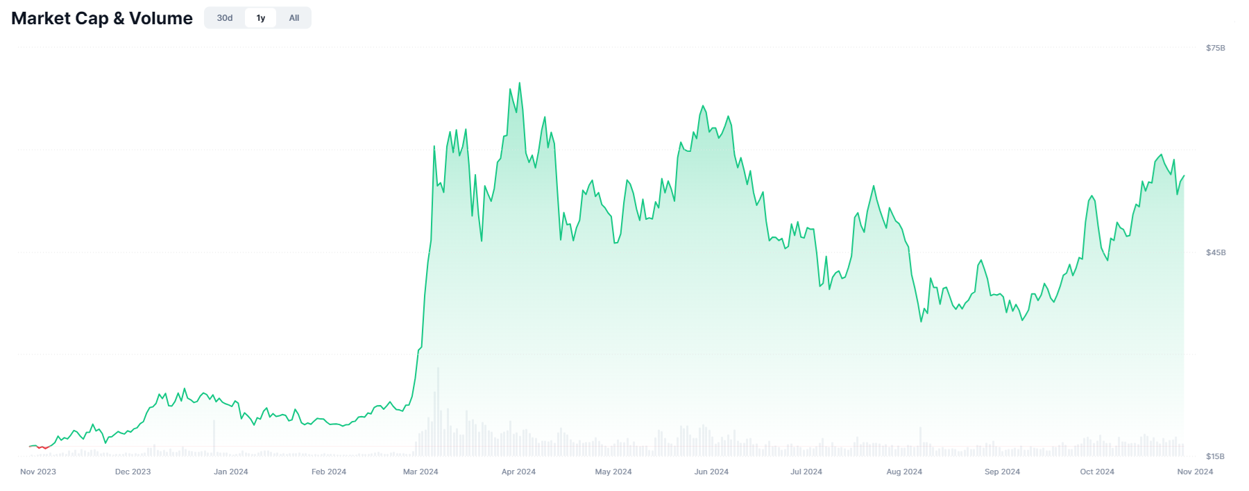Tại thời điểm viết bài, giá trị vốn hóa thị trường của meme coin đã vượt quá 56 tỷ USD, duy trì ổn định trên 50 tỷ USD trong suốt tháng 10.