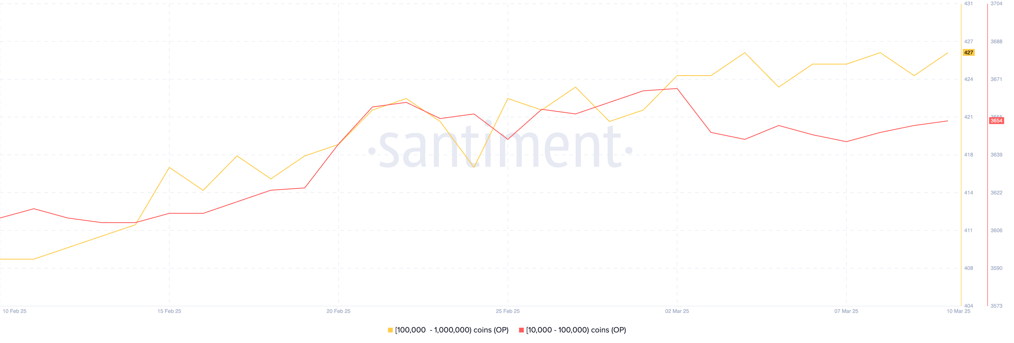 Số lượng ví nắm giữ ít nhất 10,000 OP đã tăng từ 4,071 lên 4,081 trong bốn ngày qua, cho thấy rằng một số nhà đầu tư lớn đang tích lũy bất chấp xu hướng giảm kéo dài của Optimism.