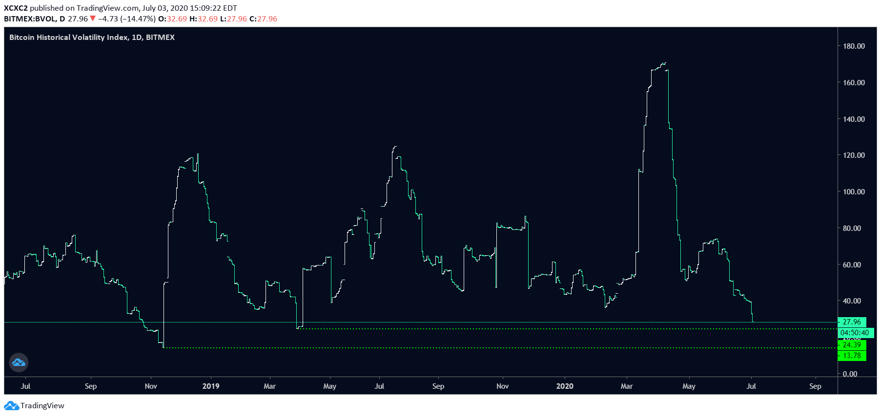 Theo dữ liệu của nhà phân tích này thì biến động của Bitcoin đang nằm ở mức thấp chưa từng được ghi nhận kể từ 3 và tháng 4/2019. Một giai đoạn mà BTC đã được giao dịch trong khu vực 3.000 USD trong khoảng 4 tháng. Sau đó, đồng coin này đã tăng 25% vào ngày 1/4.