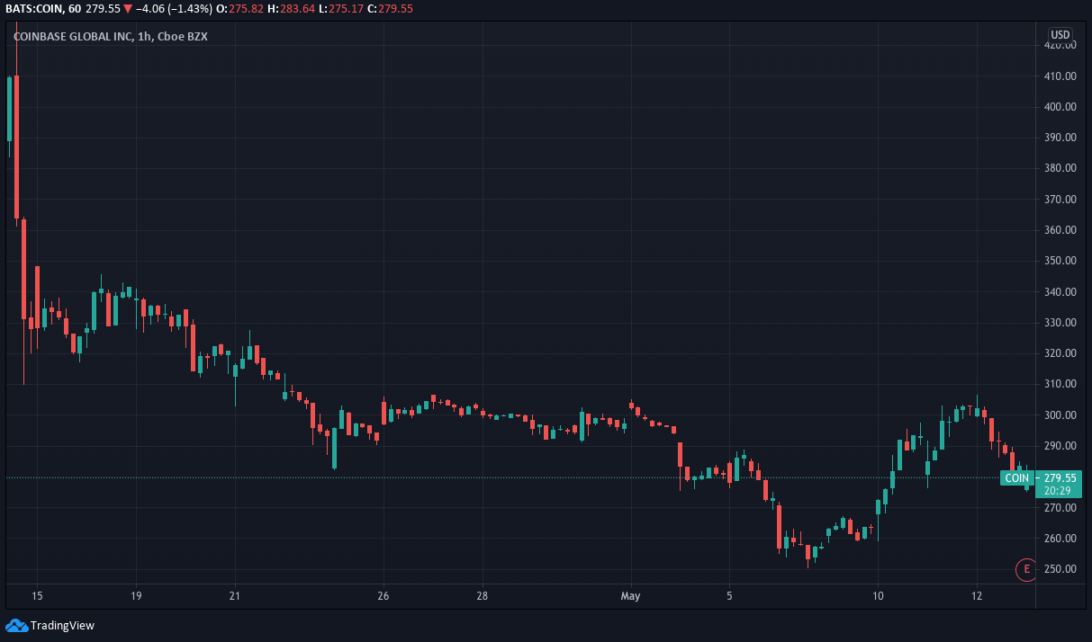 Cổ phiếu của Coinbase (COIN) đã có một tuần biến động đầy thú vị kể từ khi niêm yết vào tháng trước. Sau khi bán hết cổ phiếu trong đợt niêm yết lần đầu, giá cổ phiếu COIN đã duy trì ổn định ở mức $300 trong vòng vài tuần. Vào đầu tháng 5, giá COIN đã giảm khá nhiều về chỉ còn $250 vào ngày 6 tháng 5. Nhưng trong tuần qua COIN đã bật tăng trở lại $300, để rồi lại giảm xuống một lần nữa vào ngày hôm qua. Cổ phiếu COIN hiện đang giao dịch ở $280.