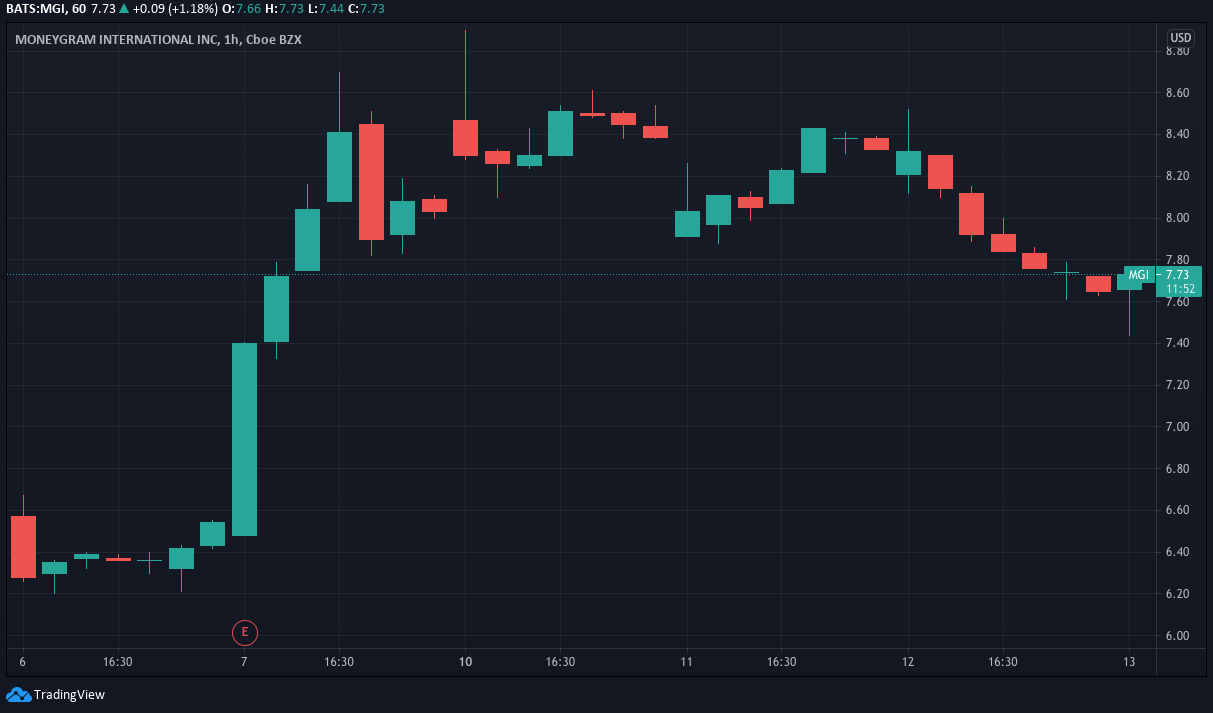MoneyGram đã có một tuần khởi sắc giống như kết quả kinh doanh quý I của họ thông báo vào tuần trước. Vào ngày 6 tháng 5, giá cổ phiếu MGI vào khoảng $6.40. Khi kết quả kinh doanh quý I được công bố, giá cổ phiếu đã tăng gần $1 trong giờ giao dịch đầu tiên của ngày hôm sau.