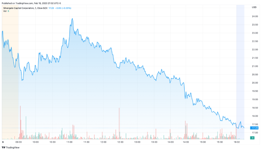 Silvergate, một ngân hàng nổi tiếng thân thiện với tiền điện tử, gần đây đã được đưa vào tầm ngắm của cơ quan quản lý, do các liên kết của Silvergate với sàn giao dịch tiền điện tử FTX đã bị sập. Những tin đồn chưa xác thực kéo theo sự mất lòng tin từ cộng đồng đã gây thiệt hại cho giá cổ phiếu của Silvergate, hiện đang ở mức thấp nhất dưới 20 USD.