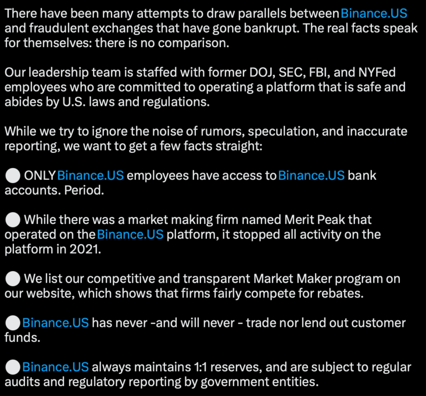 BeInCrypto đã liên hệ với đội ngũ của Binance để nhận xét về vấn đề này. Tuy nhiên, phía Binance đã từ chối bình luận về sự việc: “Chúng tôi không có bình luận về điều đó.” Hơn nữa, người phát ngôn của Binance nói với BeInCrypto rằng đây là vấn đề của Binance.US; họ là một thực thể riêng biệt và độc lập với Binance.com. Bạn có thể chuyển tiếp yêu cầu nhận xét/câu hỏi của bạn tới họ. Sau đó, đội ngũ tại chi nhánh Mỹ đã chia sẻ ảnh chụp màn hình với BeInCrypto có nội dung như sau: