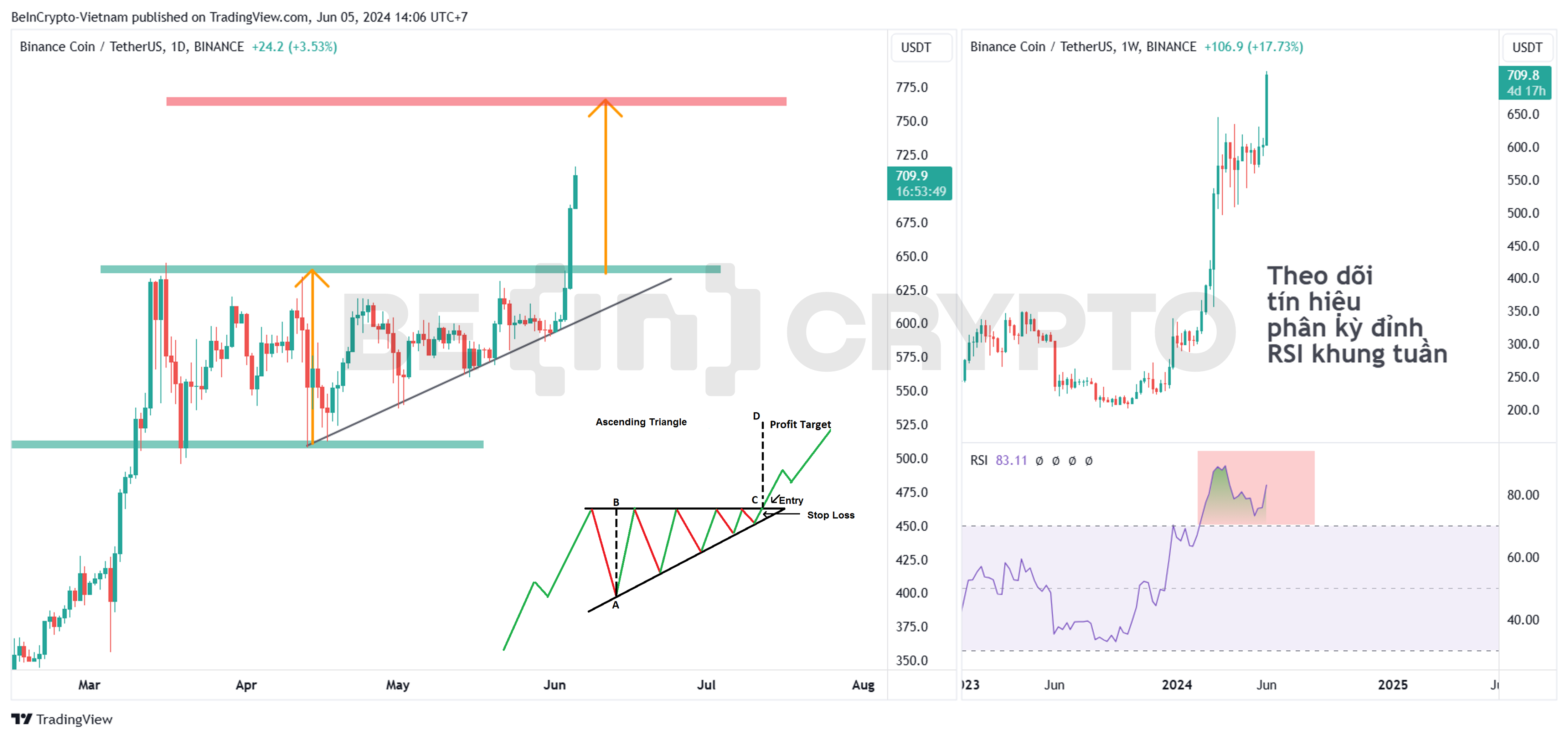 - Tín hiệu bearish đến từ RSI khung tuần dù chưa hình thành rõ ràng như đáng để theo dõi từ sớm. Đó là tín hiệu phân kỳ đỉnh khung tuần. Nếu BNB đóng nến tuần này mà RSI thấp hơn đỉnh trước, thì giá có thể giảm hoặc điều chỉnh trở lại các hỗ trợ bên dưới, mà gần nhất là vùng 635 USD.