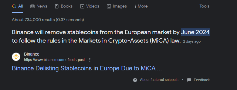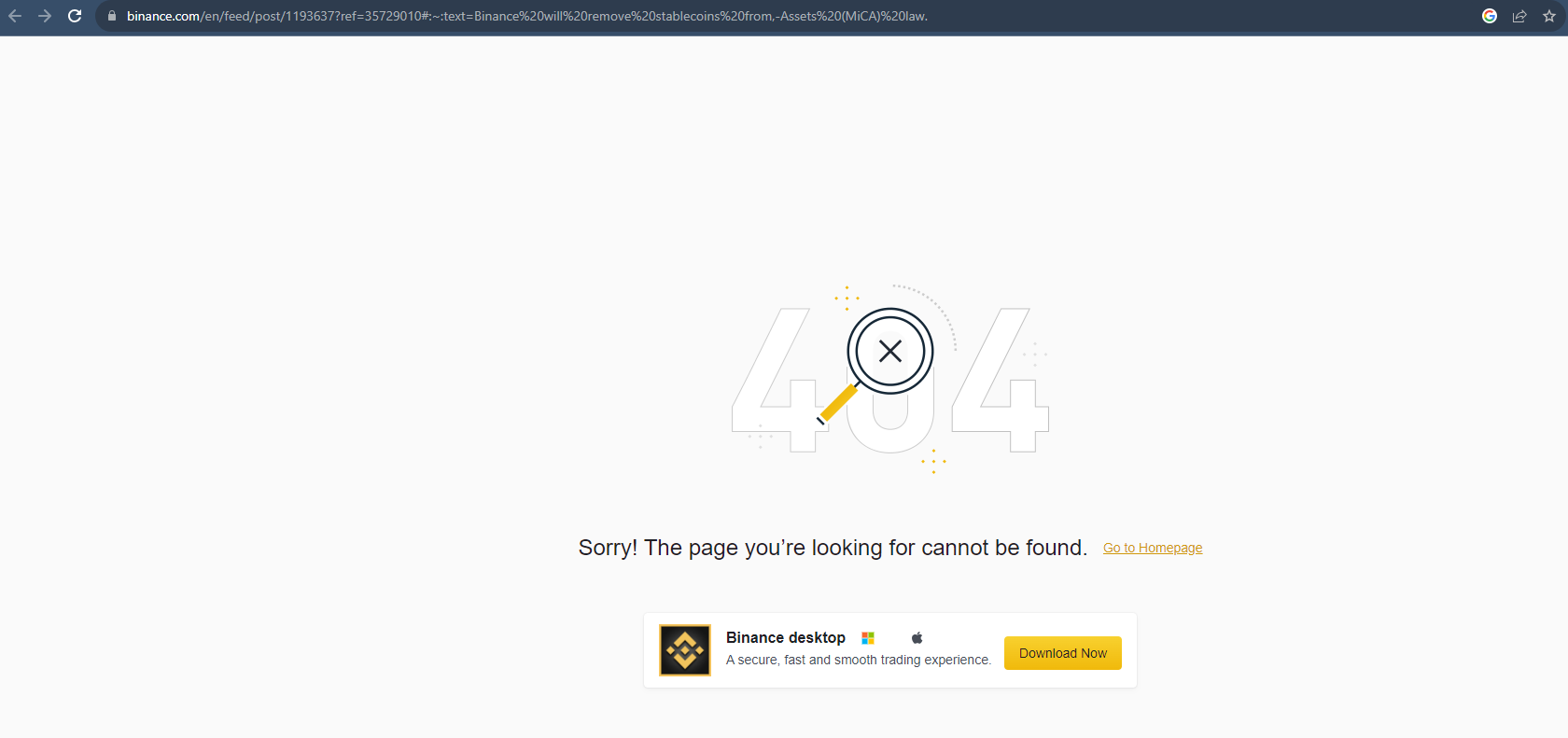 Trong một thông báo mới nhất từ chính website của sàn giao dịch Binance, họ đưa ra thông tin rằng sẽ gỡ bỏ các đồng stablecoin khỏi thị trường châu Âu từ tháng 6/2024 để tuân theo các quy định trong luật Thị trường tài sản tiền điện tử (MiCA). Tuy nhiên, thông báo này sau đó đã bị gỡ đi.