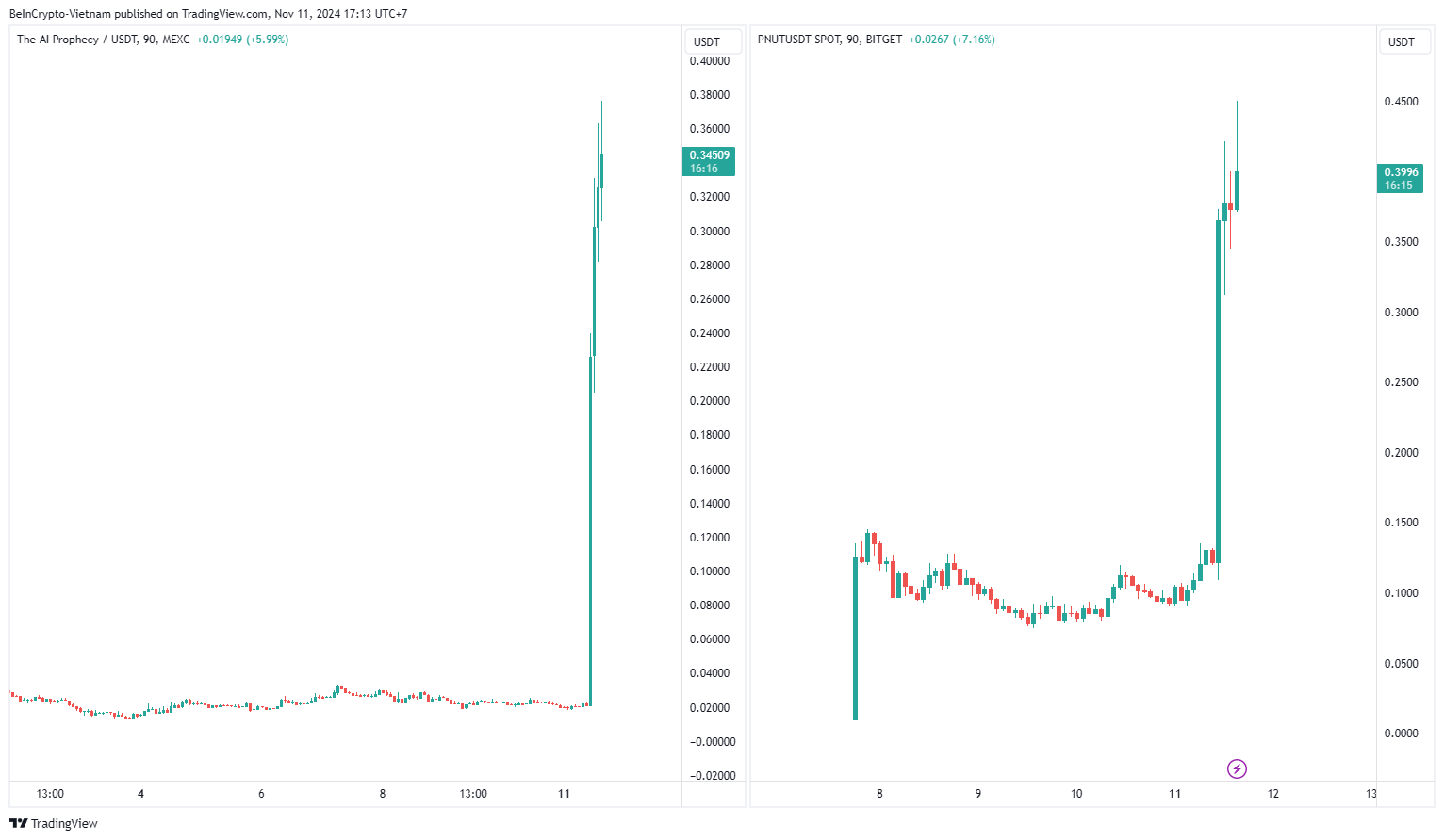 Trước thông báo niêm yết, The AI Prophecy (ACT) là một meme coin chủ đề AI có vốn hóa chỉ 20 triệu USD và khối lượng giao dịch trong ngày chưa tới 30 triệu USD. Tương tự, Peanut the Squirrel (PNUT) cũng là một Solana meme coin có vốn hóa chưa tới 100 triệu USD và khối lượng 24h chỉ khoảng 50 triệu USD.