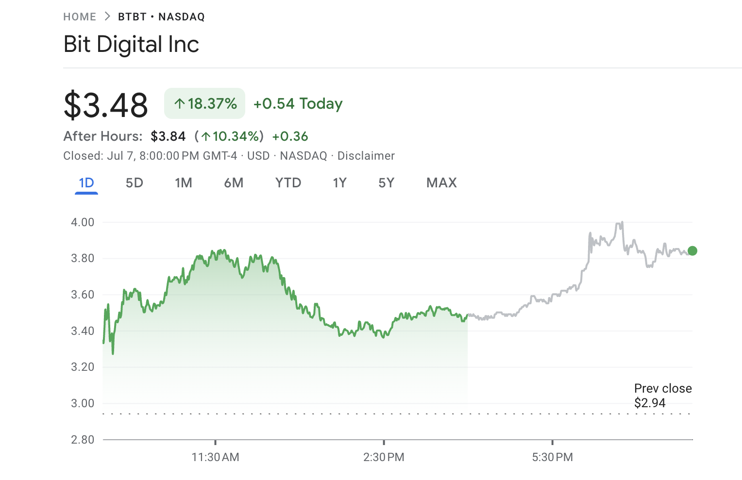 Thông báo này đã gây ra một phản ứng mạnh mẽ từ thị trường. Theo dữ liệu từ Google Finance, cổ phiếu của Bit Digital đã tăng 18.37% khi kết thúc giao dịch vào ngày 07/07. Công ty cũng chứng kiến mức tăng thêm 10.3% trong giao dịch ngoài giờ, phản ánh sự tin tưởng của nhà đầu tư vào chiến lược mới của họ.